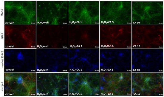 Representative microphotographs of primary neurons treated with carnosic acid (CA, 1–10 μM) and H2O2 (200 μM) for 24 h. After the treatment, the cortical neurons were fixed and immunostained with a neuronal marker (anti-MAP-2, green), astrocyte marker (anti-GFAP, red), and nuclear dye Hoechst 33342 (blue).