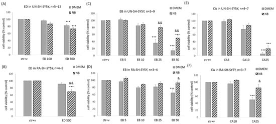 The impact of various experimental mediums (DMEM vs. NB) on the biosafety profile of edaravone (ED, (A,B)), ebselen (EB, (C,D)), and carnosic acid (CA, (E,F)) in undifferentiated (UN-) and retinoic acid (RA-)-differentiated SH-SY5Y cells. The UN- and RA-SH-SY5Y cells growing overnight in neuroblastoma (DMEM) or neuronal (NB) experimental medium were treated with ED (100 and 500 μM), EB (5–50 μM), or CA (5–25 μM) for 24 h. Cell viability was measured by WST-1 assay. Data after normalization to vehicle-treated cells (100%) are presented as a mean ± SEM. The number of independent experiments (n) is indicated in each graph. *** p < 0.001 vs. vehicle-treated cells; & p < 0.05 and && p < 0.01 NB vs. DMEM medium for indicated drug concentration.