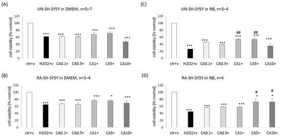 Neuroprotective effect of carnosic acid (CA) against the H2O2-induced cell damage in UN- and RA-SH-SY5Y under various experimental mediums (DMEM vs. NB). The UN- and RA-SH-SY5Y cells growing overnight in neuroblastoma (DMEM), or neuronal (NB) experimental medium were treated either with vehicle or with CA (0.1–10 μM) in combination with H2O2 (375 and 500 μM for UN- and RA-SH-SY5Y cells, respectively) for 24 h. Cell viability was measured by WST-1 assay. Data after normalization to vehicle-treated cells (100%) are presented as a mean ± SEM. The number of independent experiments (n) is indicated in each graph. * p < 0.05 and *** p < 0.001 vs. vehicle-treated cells; # p < 0.05 and ## p < 0.01 vs. H2O2- treated cells.
