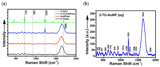 In our study, the SERS spectrum of the 2-TU-AuNPs colloid (pH = 6.7) exhibited new peaks when compared to the unfunctionalized, citrate-capped AuNPs (Figure 4a). Although most of these spectral features are small in intensity when compared to the water signals (i.e., 1643, 3262, and 3399 cm−1) of the overall 100–4000 cm−1 spectrum of 2-TU-AuNPs, they are the strong (e.g., 718 and 925 cm−1) and very strong (e.g., 1225 cm−1) if excluding the characteristic vibrational modes of water (Figure 4b). These vibrational modes are also present in the Raman spectra of 2-TU powder (719, 922, and 1225 cm−1—Figure 4a) and 0.8 mM of 2-TU aqueous solution (pH = 6.3; 722, 918, and 1225 cm−1—Figure 4c). However, they are not enhanced in intensity as observed in the SERS spectrum of 2-TU-AuNPs (i.e., 925 and 1225 cm−1—Figure 4b). In another SERS study, which was conducted on 0.04 mM of 2-TU (pH = 7) deposited as an analyte onto glass slides covered with citrate-capped AuNPs, these marker bands were observed at similar positions (718, 918, and 1224 cm−1) [28]. These studies also showed that pH has no influence on the adsorption behavior of 2-TU (pKa1 < 0.5 for uracil [1]) at the AuNPs [28]. The peak at 1224 cm−1 was assigned to the C6H and N1H scissoring coupled to the C2N3C4 asymmetric stretchings of 2-TU [28]. The shifts at 718 and 918 cm−1 were attributed to the 2-TU ring deformations and N3C4C5 symmetric stretchings [28]. These vibrational modes (e.g., 718, 922, and 1225 cm−1) correspond to in-plane vibrations, suggesting vertical or tilted adsorption of 2-TU onto the citrate-capped AuNPs, and the immediate proximity of its S and N atoms to the nanosurface (Figure 5). This binding geometry is supported by the SERS surface selection rules [28,29,30]: the in-plane vibrational modes of 2-TU are more enhanced than its out-of-plane vibrational modes when the drug molecules are adsorbed vertically onto the AuNP nanosurface. Other in-plane vibrational modes were detected at 1388 and 1444 cm−1 in the spectrum of 2-TU-AuNPs (Figure 4b). There were also considerable shifts (~4–7 cm−1) in the peaks at 718 and 925 cm−1 of 2-TU-AuNPs with respect to those of the aqueous solution of 2-TU (Figure 4b,c). The spectral resolution was ~1 cm−1. The chemical attachment of 2-TU through its S atom was further substantiated by the appearance of a CS stretching mode [28] at 1168 cm−1 in the spectrum of 2-TU-AuNPs (not present or very small for 2-TU (aq)). Prior theoretical studies on 2-TU and its chemisorption mechanism demonstrated both 2-TU-AuNP complexed tautomers (Figure S3) as possible at this pH value of 6.7 [28]. Overall, the observed Raman/SERS spectral changes suggest a chemisorption of 2-TU to the AuNPs through the S and/or N atoms, in an inclined or vertical orientation. No peaks characteristic to the Au-S or Au-N stretching modes could be visibly assigned in the low spectral region of the 2-TU-AuNP spectrum due to interference of the strong Rayleigh scattering.