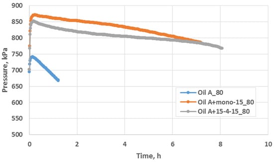 The oxidation stability was determined on the basis of the accelerated oxidation test using the PetroOxy method. The oxidation induction time (Figure 13) was determined based on the obtained graphs of the pressure drop as a function of the oxidation time, proving the resistance to the oxidation process of the tested lubricants.