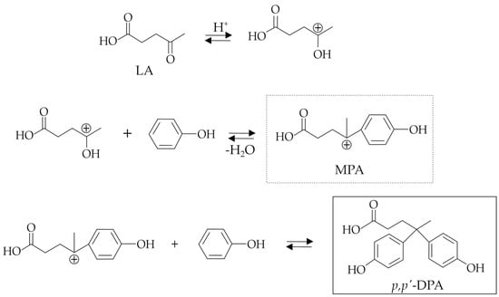 According to Rahaman et al. [16], the reaction mechanism of DPA synthesis (Figure 2) involves the preliminary formation of the mono-phenolic acid (MPA) intermediate via activation of the LA ketone group, followed by the subsequent nucleophilic attack of the phenol and finally through the acid-catalyzed loss of a water molecule. The obtained carbocation intermediate (MPA) undergoes the nucleophilic attack of another phenol molecule to obtain the target DPA.
