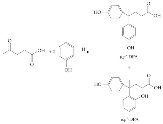 Due to the structural similarities, DPA has been identified as a potential replacement for bisphenol A (BPA), the latter representing one of the most adopted monomers for the synthesis of epoxy resins and polycarbonates [5,6], which are widely exploited for the formulation of paints, cosmetics, surfactants, plasticizers, textile chemicals, etc. [7,8]. However, BPA is well-known for its dangerous toxicological properties, which mime the effects of estrogens and thus disrupt the endocrine system, even at very low concentrations (<1 ng L−1) [9,10]. Moreover, BPA use has been associated with the onset of health issues, such as cancer, obesity, and diabetes [11,12], and its use, especially in foodstuffs, is strictly regulated by European Food Safety Authority (EFSA) legislation [13]. In this context, DPA represents an excellent substitute for BPA, and the progressive lowering of the LA production costs makes further R&D on this topic particularly valuable. Moreover, DPA can be envisaged as a completely bio-based molecule if the phenol production from renewable lignin sources, mainly through pyrolysis or reductive depolymerization, will be implemented on an industrial scale [14,15]. Remarkably, such pathways could be even better tailored to give substituted phenols (catechol, resorcinol, cresol, guaiacol, etc.), thus further broadening the application opportunities of the final specialty biomaterials. Whilst BPA is produced through a condensation reaction between acetone and two moles of phenol, in the DPA synthesis, acetone is replaced by LA, and both reactions require the presence of a proper Brønsted catalyst. A comparison between the reactions involved in the BPA and DPA syntheses is shown in Figure 1.