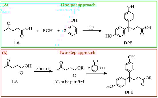 The presence of one carboxyl group and two phenolic ones makes DPA an interesting molecule to be exploited for the synthesis of a plethora of more added-value bio-products. On the other hand, the reactivity of DPA must be properly controlled to avoid unwanted reactions, including its self-condensation [29,38]. Moreover, it can undergo oxidation and degradation over time [39,40], which can limit its shelf life and usability in several applications, thus requiring careful attention to its stability during the synthesis of the DPA-derived polymers; for instance, when transforming the carboxyl group of DPA in esters, ethers, or amide derivatives [41,42]. To date, DPA has been exploited for the synthesis of epoxy and phenolic resins [6,43] as well as other polymers, such as polycarbonates [44,45], polyarylates [46], and polyesters [47]. Both DPA-based epoxy and phenolic resins find applications in the production of composites, adhesives, and coatings [48,49]. Some niche applications of DPA have been proposed, including the production of thermal paper for printers [50], coatings, and adhesives [51,52,53]. Moreover, DPA and its derivatives show good antioxidant, antiviral, and antibacterial properties, making them suitable for the development of valuable applications in the cosmetic, food, textile, and polymer sectors [27,33,54,55]. Such materials could be obtained from the diphenolate derivatives. In this context, alkyl levulinates (ALs) were proposed by Olson in 2001 [56] as a replacement for LA in the synthesis of new diphenolate esters (DPEs). Remarkably, the reaction between ethyl levulinate (EL) and phenol under conditions analogous to those used for LA enables the production of DPE, but only in low yields, thus highlighting a much more moderate reactivity of the ALs. However, when the reaction conditions were properly modified, very high yields of the DPE (95 mol%) were ascertained, which were even greater than those obtained when starting from LA (67 mol%). The most efficient method for the synthesis of DPE from EL was achieved by using concentrated sulfuric acid as the catalyst, followed by dilution with ethanol at the end of the reaction. The residual reactants were steam-distilled off the product, but no further details regarding synthesis or purification were reported. Pancrazzi et al. [57] performed the one-pot synthesis of DPEs, which involved the LA’s esterification to EL and the cascade condensation of the latter with phenol and ortho-substituted phenols (R = 2-Me, 2-iso-Pr, 2-sec-Bu) without any intermediate purification step of ethyl levulinate. In principle, methyl and ethyl levulinate are the preferred ALs to be employed to exploit their highest esterification yields [58]. Therefore, two different approaches can be proposed for the synthesis of DPEs by employing ALs as starting materials (Figure 4).