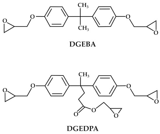 In deepening the exploitation possibilities of DPA, it is well-known that the synthesis of BPA glycidyl ethers (DGEBA) represents valuable polymers due to their robust mechanical properties, favorable thermodynamic characteristics, and remarkable stability [63]. DGEBA and its oligomers account for 90% of the global production of epoxy resins [64]. A similar approach to that of BPA can also be proposed for DPA, thus obtaining the corresponding glycidyl ethers (DGEDPA). Both chemical structures of the corresponding glycidyl ether monomers are reported in Figure 5.