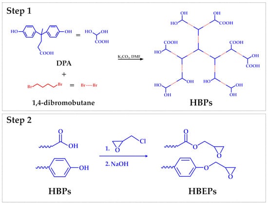 The research towards the development of new DGEDPA-based materials is mainly aimed at solving some well-known DGEBA performance drawbacks, including high brittleness and poor impact resistance, due to its inherent rigid aromatic rings [65]. DGEDPA-based epoxy thermosets characterized by a hyperbranched structure may enhance mechanical strength and toughness simultaneously [66]. The hyperbranched structure generated through the reactivity of the carboxyl group of the DPA can significantly increase the crosslink density in thermosets, thereby enhancing their mechanical strength. This crosslinking could be obtained through the synthesis of ethers, esters, and amide derivatives of the DPA, thus exploiting the reactivity of its carboxylic group. In addition, hyperbranched polymers have a higher proportion of free volume than their linear counterparts, which helps to improve the toughness of DPA-based epoxy resins [67]. In this context, Wei et al. [42] synthesized a new DGEDPA-based polymer starting from DPA and epichlorohydrin to obtain a trifunctional epoxy resin. The obtained DGEDPA was cured with 3,3′-dimethyl-4,4′-diaminodicyclohexylmethane, and the final material exhibited better performance than that of the DGEBA-based one, including higher curing temperature, glass transition temperature, and thermal expansion characteristics [42]. Consequently, the authors claimed that this innovative epoxy resin shows promising potential for various critical applications, including aerospace and microelectronics. Regarding the electronic applications, McMaster et al. [68] tested a series of diglycidyl ethers of diphenolate esters (DGEDPE) as dielectric materials to be proposed in substitution of DGEBA. Methyl, ethyl, propyl, and butyl esters of DPA were synthesized and studied. Remarkably, the DGEDP-propyl showed the highest dielectric constant, with results comparable to those of the traditional DGEBA. The authors stated that variations in the dielectric characteristics of DGEDP-esters result from the complex interplay between segmental, local, and side-chain movements on one side and the influence of free volume and steric hindrance on the other. The research formed the groundwork for the development of new DGEDPE-based epoxy resins, with the intention to improve polarization and dielectric constants, which are valuable physical properties for such types of applications. Developing a different approach, Xiao et al. [65] synthesized different DPA-based hyperbranched epoxides (HBEPs) from DPA and dibromobutane to improve the mechanical properties of the final resin. A two-step synthetic approach was proposed by the authors (Figure 6). In the first step, hyperbranched polymers (HBPs) were synthesized through polymerization through a condensation mechanism starting from DPA and 1,4-dibromo butane in the presence of potassium carbonate and DMF. In the second step, the epoxidation reaction of HBPs to obtain HBEPs was carried out in the presence of an excess of epichlorohydrin. In this way, terminal functional groups were modified through epoxidation through epichlorohydrin, thus obtaining the epoxy resin. This methodology utilizes DPA as the branching component, thus improving the mechanical durability due to its aromatic ring composition and adding a well-tuned flexibility by including dibromo butane. Such hyperbranched thermosets exhibited exceptional mechanical strength and toughness, with much better performances than those of commercial DGEBA thermosets [65,69].
