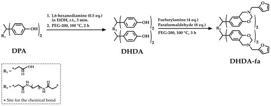 Qian et al. [41] proposed another innovative synthesis of a new class of epoxy resin with outstanding thermal performance, DPA-based polybenzoxazines, based on the amidation of DPA. First, the authors synthesized DPA hexanediammonium salt (DHDA) by reacting DPA and 1,6-hexanediamine in ethanol. Then, DHDA reacts with PEG-200, furfurylamine, and paraformaldehyde to obtain benzoxazine diphenolic hexanediamide (DHDA-fa) (Figure 7).