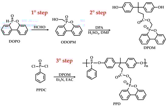 Furthermore, DPA is effective for improving the UV resistance of coatings by helping to prevent color fading and degradation when exposed to sunlight [79,80]. This is a valuable property for outdoor applications, such as architectural coatings and automotive finishes. For example, in the study by Zhang et al. [79], a novel, multifunctional, bioderived polyphosphate (PPD) for poly(lactic acid) (PLA) was synthesized through a three-step procedure (Figure 12). In the first step, 9,10-dihydro-9-oxa-10-phosphaphanthrene-10-oxide (DOPO) reacted with polyformaldehyde (HCHO) to produce a DOPO-derived compound, 2-(6-oxido-6H-dibenz[c,e][1,2]oxaphosphorin-6-yl)-methanol (ODOPM). ODOPM reacted with DPA in the presence of N, N-dimethylformamide (DMF) and sulfuric acid (as the acid catalyst) to produce (6-oxidodibenzo[c,e]› [1,2]oxaphosphinin-6-yl)methyl 4,4-bis(4-hydroxyphenyl)pentanoate (DPOM). Lastly, DPOM reacted with phenylphosphonic dichloride (PPDC) in ethyl acetate (EAC) and triethylamine (Et3N) to give the target PPD.