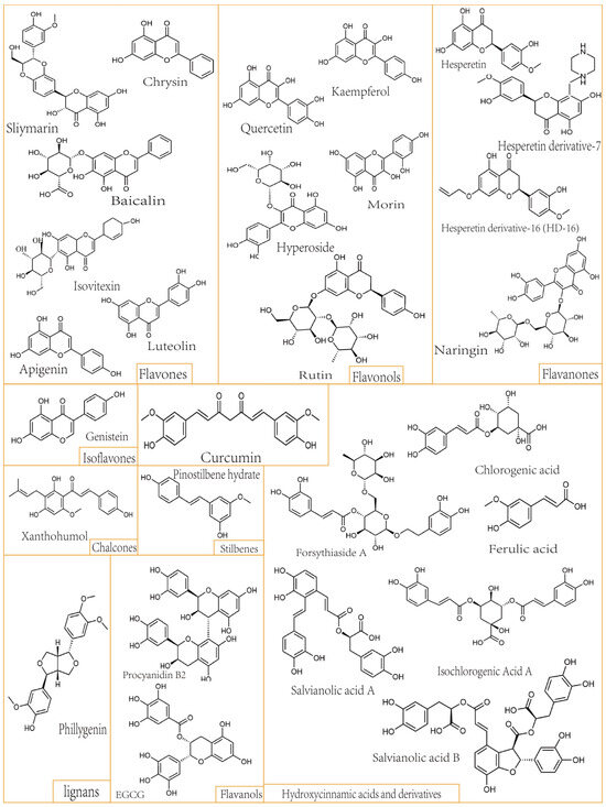 Surprisingly, medicinal and food homologs contain a wide range of active substances and nutrients [23]. Some phenols are associated with nutritional and health claims in medicine and food, highlighting this class of ubiquitous, varied, yet unknown compounds. However, health professionals, food technologists, analysts, and consumers do not pay sufficient attention to the phenols in food [24]. These molecules can be divided into phenolic acids, flavonoids, tannins, astragals, and lignans according to the number of phenolic rings and their binding mechanisms [25]. Their classification by molecular mass divides them into polyphenolic monomers, which include both phenolic acid compounds and flavonoids, and tannins formed by the polymerization of monomers [26]. Phenolic acids are divided into two subgroups that have either benzoic acid or cinnamic acid as the parent core, with at least one aromatic ring in its structure and at least one hydrogen substituted by a hydroxyl group on the ring [25]. The subclasses include flavanols, flavanones, flavones, isoflavones, flavonols, and anthocyanidins [27]. Tannins are mainly divided into condensed tannin and hydrolysable tannin, according to their chemical structure. Condensed tannins are oligomers or polymers formed by the polymerization of catechin, epicatechin, gallocatechin, and epigallocatechin in specific ratios; whereas hydrolysed tannins are composed of gallic acid or sugar-containing acids and their derivatives, typified by tannic acid [28]. Lignans are polymers of natural polyphenols that are mainly used in industrial production, and their pharmacological effects have not been extensively studied. Figure 1 shows the classification of dietary polyphenols. Polyphenols are typified by o-triphenols and catechols. They are powerful antioxidants and free radical scavengers owing to their easily oxidized o-phenolic hydroxyl groups [29] and are associated with a reduced risk of cancer, insulin resistance, cardiovascular diseases, chronic inflammation, and degenerative diseases [30,31,32]. They are receiving increasing attention for the development of potential drugs for the treatment of liver diseases, and many dietary polyphenols have been found to protect against liver fibrosis by inhibiting HSC activity through different signaling pathways. These include apigenin, epigallocatechin-3-gallate (EGCG), quercetin, icaritin, curcumin, and resveratrol [31]. In addition, dietary polyphenols help maintain the homeostasis of human intestinal microorganisms, and the metabolites in microorganisms can regulate the liver and liver fibrosis through signaling pathways. Here, we review previously publications to demonstrate how dietary polyphenols inhibit liver fibrosis through different signaling pathways, gut microbiota, and metabolites. Nanotechnology is also reviewed for its role in improving the poor bioavailability of polyphenol compounds. We discuss current research limitations and propose future directions which would encompass the use of polyphenols to alleviate liver fibrosis and prevent its progression to more serious conditions.