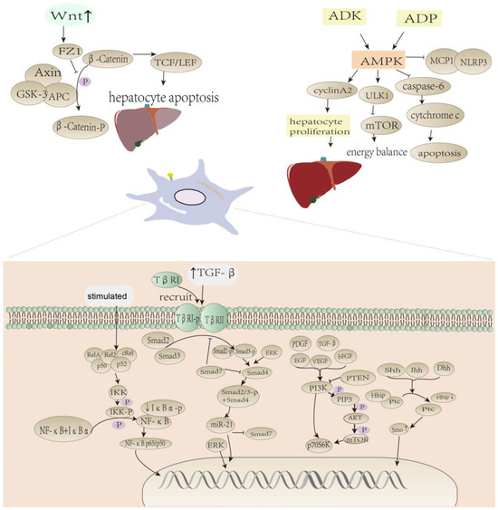 Adenosine monophosphate (AMP)-activated protein kinase (AMPK), which senses energy status and controls energy consumption and storage, is an important metabolic regulator [42]. A recent study demonstrated that the AMPK pathway is closely related to liver fibrosis; AMPK can robustly control the proliferation of HSCs, and the lack of AMPK can accelerate the development of liver fibrosis [92]. Studies have shown that adiponectin agonist ADP355, as an agonist of AMPK, alleviates liver fibrosis by promoting AMPK phosphorylation [93]. AMP or adenosine diphosphate (ADP) binding facilitates the phosphorylation of AMPK and increases its antifibrotic activity [94]. The secretion of monocyte chemoattractant protein (MCP)-1 increases the recruitment of inflammatory cells to the site of tissue injury and regulates adhesion molecules and pro-inflammatory cytokines [95]. AMPK can inhibit pro-inflammatory signaling pathways, reduce MCP-1 expression and inhibit NOD-, LRR-, and pyrin domain-containing (3) inflammasome activation to prevent liver inflammation [96]. An autophagic process involves the degradation, recovery, and metabolization of organelles and macromolecules. AMPK is activated in response to metabolic stress, and mTOR is inactivated in response to UNC-51 like kinase protein-induced activation of liver mitochondrial phagocytosis [97]. The activation of AMPKα1 upregulates cyclin A2 transcription and promotes hepatocyte proliferation, finally restoring liver mass after partial hepatectomy. Once the activation of AMPK is reduced, pro-apoptotic caspase-6 cleavage induces the release of cytochrome c, which consequently supports the activation of the executioner caspases and apoptosis in a feed-forward mechanism, leading to liver injury and liver fibrosis [44,98]. Treatment with AMPK activator and caspase-6 inhibitor for two weeks significantly reduced the death of hepatocytes and liver fibrosis. Caspases are related aspartic proteinases that regulate inflammation and cell death [42]. In addition, blocking mTOR and phosphorylating AMPK ameliorates liver fibrosis [46]. A role for AMPK in liver injury treatment may be to maintain energy balance by inhibiting mTOR [99]. AMPK-mTOR is a classic upstream signal-regulation pathway of autophagy. Inhibition of the AMPK signaling pathway leads to a decreased autophagy level. Autophagy is characterized by microtubule-associated protein light chain 3 (LC3) and Beclin1 [100]. Apoptosis and autophagy can be regulated by AMPK, which is located upstream of Beclin1 and B-cell lymphoma-2 (Bcl-2). It has been shown that destroying the Beclin1/Bcl-2 complex increases autophagy in mammals [47]. Although autophagy acts as a double-edged sword in liver fibrosis [99], the role it plays in liver fibrosis remains controversial and needs further study.
