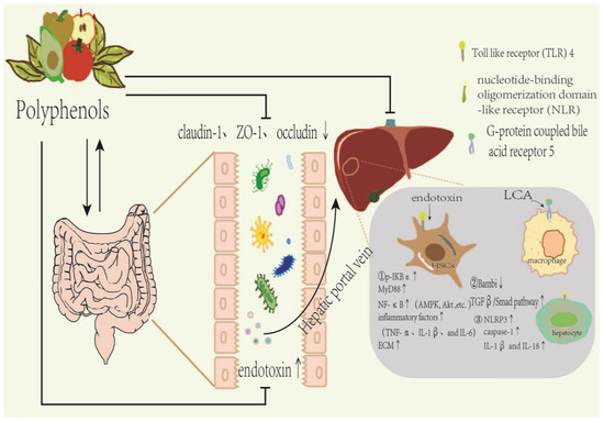 Many studies have reported that dietary polyphenols can decrease liver inflammation and liver fibrosis by regulating the regulation of the liver-related inflammatory signaling pathway using the metabolites of intestinal microorganisms. For example, baicalin has potential therapeutic effects on liver and intestinal diseases by regulating farnesoid X receptor (FXR) and TGR5 to mediate bile acid crosstalk related to intestinal microorganisms. Baicalin helps to increase the number of bacteria producing SCFA, reduces the phosphorylation of PI3K, AKT and mTOR, and lowers the level of IL-17 to inhibit liver fibrosis [111,177]. Chlorogenic acid treatment of liver fibrosis is mainly through improving the intestinal microbial composition, increasing the level of SCFA, and inhibiting inflammatory factors [178]. It mainly inhibits the activation of the TLR4 signaling pathway, including the reduction of TLR4, MyD88 expression, the increase in Bambi and IKB proteins, the nuclear translocation of NF-κB and p-IKB-reduction [37]. In addition to chlorogenic acid, isochronogenic acid A (ICQA) reduces liver fibrosis and the expression of high-mobility group box 1 (HMGB1) and TLR4, alleviates NF-κB p65 nuclear translocation, and inhibits p-IKB expression. It is suggested that ICQA protects against liver fibrosis induced by CCl4 by inhibiting the HMGB1/TLR4/NF-κB signaling pathway [54]. PHI reduces the level of LPS in serum and of inflammatory factors (IL-1β, IL-6, and TNF-α) in liver tissue [22]. It promotes the production of SCFA, regulates the imbalance of bile acid, and may alleviate liver fibrosis [166]. Forsythiaside A (FTA), as a polyhydroxy structural compound, reduces LPS, macrophage inflammatory protein-1 and TNF-α in serum. Additionally, FTA increases the abundance of SCFA-producing bacteria and SCFA products, thus protecting the liver [22]. It can be concluded that the interaction between dietary polyphenols and the intestinal microenvironment is essential for the clinical treatment of liver fibrosis.