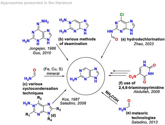 Various methods for the preparation of 2-aminopurine are presented in the literature (Scheme 1). One of the methods for obtaining the target product is the hydrogenation of 6-chloraminopurine []. In other publications [,], the authors use deamination methods. Thus, in [], the dehalogenation of 6-chloropurine by microwave irradiation in water is used. In another study [], the intermediate product is hydrazinopurine, which is formed by the deamination of 4,9-dihydro-purine-1,2-diamine. In this way, these two methods, which are described above, involve the removal of an amino group from the precursor compound to give 2-aminopurine. Alternatively, various cyclocondensation procedures have been reported in publications [,] to obtain the desired product. These methods involve the formation of a cyclic compound by the condensation of suitable precursors. The authors describe the one-pot synthesis of a large panel of nucleic bases and related compounds from formamide in the presence of iron-sulfur and iron-copper sulfur minerals as catalysts. Another paper reports the catalytic effect of several types of meteorites: iron, stony-iron, chondrites, and achondrites []. Thus, meteorite technologies are considered as a potential method of synthesis of 2-aminopurine. These technologies involve the use of meteoritic materials or processes to facilitate the synthesis. Another approach to obtain the target product is the application of 2,4,6-triaminopyrimidine via the cyclization of the vicinal diamine group, with 5-nitrouracil as the starting reagent [].