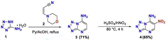 The interaction of 1H-tetrazol-5-amine 1 with morpholinoacrylonitrile 2 in a 1:1 mixture of pyridine and acetic acid leads to tetrazolo[1,5-a]pyrimidine-7-amine 3 (71%) (Scheme 2). Acetic acid and pyridine act as analogs of “ionic liquids”, with the basic properties of pyridine and the acidic properties of acetic acid also favoring condensation reactions []. The structure of the obtained tetrazolo[1,5-a]pyrimidine-7-amine 3 was confirmed by 1H NMR, 13C NMR, IR spectroscopy, and elemental analysis data. It should be noted that in the 1H NMR spectrum, there are two characteristic doublets with a spin–spin interaction constant of J = 7.5 Hz in the region of δ = 6.59–6.61 ppm and δ = 8.89–8.91 ppm, corresponding to the aromatic protons of the pyrimidine cycle. In turn, the protons of the primary amino group appear as a broadened singlet in the region of δ = 7.74 ppm. The presence of the primary amino group is also confirmed by infrared spectroscopy, as the corresponding spectra show a broadened band of low intensity in the region of 3100 cm−1 (Figures S1 and S5, see Supplementary Materials). The second step of the synthesis was the nitration of tetrazolo[1,5-a]pyrimidine-7-amine 3. The choice of a nitrating mixture with a molar ratio of 1:6 (HNO3:H2SO4) was due to the ability of excess sulfuric acid to reduce the oxidative properties of the mixture. The nitration process proceeds smoothly and in good yield (65%). No oxidation of the amino group was observed; thus, this protocol eliminates the additional steps of the introduction and removal of protecting groups. As a result, 6-nitrotetrazolo[1,5-a]pyrimidine-7-amine 4 was obtained in 65% yield (Scheme 2).