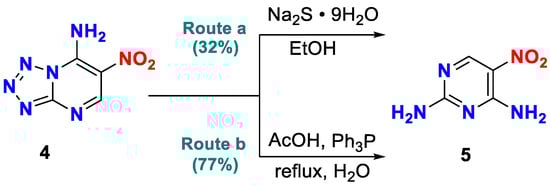 It turned out that sodium sulfide nonahydrate, aqueous in alcoholic medium, undergoes a reduction of the tetrazole fragment to the amino group, which leads to the preparation of 5-nitropyrimidine-2,4-diamine 5 (32%) (Scheme 3. Route a).