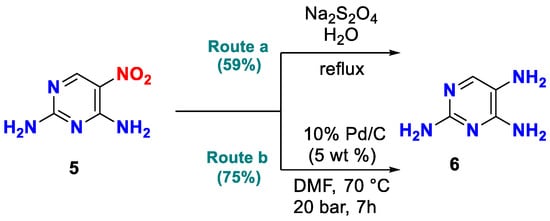 In the next step, we attempted the reduction of the nitro group to obtain the target pyrimidine-2,4,5-triamine 6. In the next step, we attempted the reduction of the nitro group to obtain the target pyrimidine-2,4,5-triamine 6. It is worth noting that reduction by tin or iron in an acidic medium leads to oil formation in the reaction mass (Table 2, entry 2,3). At the same time, in contrast to the reduction of 6-nitrotetrazolo[1,5-a]pyrimidin-7-amine 4, the use of sodium dithionite favors the reduction of the nitro group to the corresponding amine (Scheme 4. Route a), so pyrimidine-2,4,5-triamine 6 was obtained in 59% yield (Table 2, entry 1). Apparently, the energy barrier of this reaction is lower for pyrimidine than for its azoloannelated derivative. Nevertheless, the most successful result in this reaction was the reduction by hydrogen on palladium in dimethylformamide under heating at 20 bar, which gave the desired pyrimidine-2,4,5-triamine 6 in 75% yield (Scheme 4. Route b).