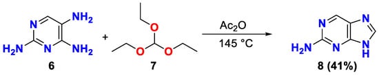 Traube synthesis is a classic method to obtain purines through the annulation of the imidazole fragment into ortho-diaminopyrimidines []. This method was not applicable to us. For the final cyclization of pyrimidine-2,4,5-triamine 6 to 2-aminopurine 8, we used different formylation reagents (Table 3). The use of triethylorthoformate, acetic acid as a catalyst, and N-formylmorpholine as a formylation agent in formic acid did not lead to the preparation of the target product 8. The results obtained clearly demonstrated that the best reagents were triethylorthoformate and acetic anhydride (Scheme 5), and 2-aminopurine 8 was obtained with a yield of 41%.