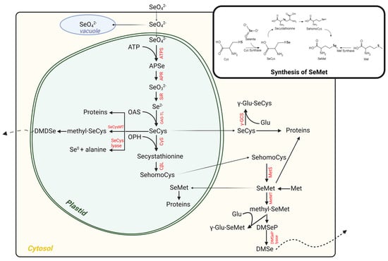 Selenium is accumulated into the plant tissues through its presence in water, soil, and air, and thereby introduced into the food chain. The uptake of inorganic Se from soil by plants is influenced by several factors, which include pH, salt levels and organic contents of the soil, and the Se assimilation characteristics of the plant species [43]. Inorganic Se exists in diverse valence states. The major inorganic form of dietary Se from plants includes selenate and selenite salts (Table 1), such as Na-selenate (NaSeO4) and Na-selenite (NaSeO3), respectively. The physical and chemical resemblance between Se and sulfur (S) implies that both these elements possibly share common metabolic pathways in plants [44]. It is likely that the sulphate transporters in plants are also selenate transporters used to assimilate Se into the plant. After the uptake of Se from the soil by plant roots, selenate is translocated to shoot tissues, therefore composing the dominant Se compound in xylem sap. Both selenite and selenate can be incorporated as organic selenoamino acids and, eventually as SePs. To elaborate, selenite is metabolized into SeMet and mainly remains in the root. Selenate is reduced to selenite in its biotransformation route to selenoamino acids (Figure 1) and involves the consecutive action of two enzymes: adenosine triphosphate sulfurylase (ATPS) and APS reductase (APR). Both APS and APR are located in both the chloroplast and the cytosol; however, the chloroplast is where selenate reduction is most likely to occur. Firstly, APS couples selenate to adenosine triphosphate (ATP), creating adenosine phosphoselenate (APSe), which is subsequently reduced to selenite by APR. Sulfite reductase (SiR) may also be involved in the reduction of selenite to selenide in the chloroplast, similar to sulfite reduction. In addition, the nonenzymatic reduction of selenite by the reducing glutathione (GSH) has also been postulated to be involved in the process [45]. Under the action of O-acetylserine (OAS) thiol lyase (also called cysteine synthase), which likely takes place in cytosol, chloroplasts, and mitochondria, selenide can be coupled to OAS to form SeCys. O-acetylserine is a signal molecule generated by serine acetyl transferase, upregulating the activity of sulfate assimilation enzymes and sulfate transporter. The first produced organic Se compound, SeCys, can be incorporated into proteins nonspecifically, in analogy with Cys, and it can be converted to SeMet, or it can be converted to dimethyldiselenide (DMDSe), elemental Se (Se (0)), or methyl-SeCys [46]. In short, the conversion of SeCys to SeMet involves the actions of three enzymes: cysthanthionine-γ-synthase (CγS), cysthathionine-β-lyase (CβL), and Met synthase. First, SeCys couples to O-phosphohomoserine (OPH) to form Se-cystathionine via CγS; subsequently, Se-cystathionine is converted to Se-homocysteine by CβL, and finally, it is converted to SeMet via the action of Met Synthase. The produced SeMet can follow multiple routes. First, it can also be misincorporated into proteins, or it can be methylated to methyl-SeMet under the action of methionine methyltransferase. Further metabolism leads to the production of dimethylselenide (DMSe), which is volatile and provides a way for excess Se to exit plants [47]. In another metabolic pathway of SeCys, the conversion of SeCys to Se (0) is via the action of selenocysteine lyase (SL). Methylated SeCys, methyl-SeCys, is not incorporated into proteins, and thus it can be accumulated in plants safely [48]. Alternatively, it can be further metabolized to another volatile Se compound, DMDSe, the predominant volatile Se form produced by Se hyperaccumulators [44,45].
