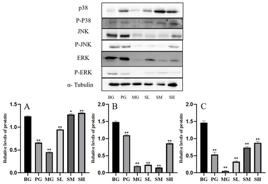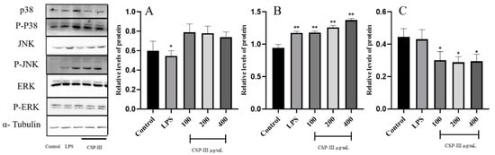 2.5.5. Effect of CSP III on the Expression of MAPK Signaling Pathway-Related Proteins in the Spleen of Mice
