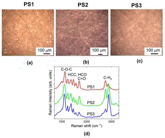 Optical images detected in white light of different paper samples: Antaimoro (PS1) (a); Funori (PS2) (b); Whatman (PS3) (c). (d) Representative Raman spectra, extracted from 2D (280 µm × 160 µm) Raman maps (448 spectra) detected for each paper samples.