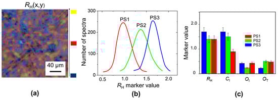 (a) Raman map of RH marker (degree of polymerization of the cellulose) of PS3 paper sample, overlapped with its optical image; (b) RH distributions for PS1, PS2, PS3 paper samples; (c) Peak values for RH, CI, OI, OT markers for each paper samples.