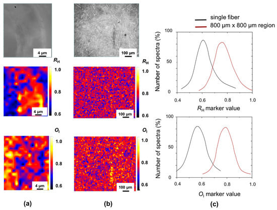 If we compare the correlated maps of RH and OI markers for the single fiber in Figure 3a, we observe that, as discussed before, the hydrolysis and oxidation processes proceed more slowly on an ordered structure, such as the fiber wall where we measured the highest RH values, and the lowest OI values. By increasing the sampled area, the corresponding marker distribution of RH and OI index moves to a larger peak value, see Figure 3c, as longer and more oxidized fibers were included (e.g., yellow fiber in the OI maps reported in Figure 3b).