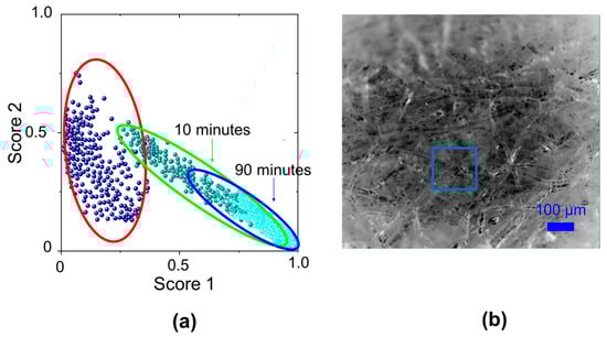 Following this procedure for each point of the grid, we built the plot in Figure 5a, by reporting for each Raman spectrum the coefficients of linear combination in an x, y plane, with on the x-axis the score of paper spectrum component and on y-axis the score for graphite spectrum component. This results in points with a large score value in y and a small score value in x for the paper contaminated with graphite particles (red ellipse). After the application of hydrogel for 10 and 90 min, a new Raman map is acquired and a new set of core values is calculated (green and blue ellipses). The ellipse that encloses the score points moved to the right lower corner of the x, y plane, indicating a good removal of graphitic particles due to the hydrogel cleaning action, as shown in Figure 5b where the blue square box indicates the sample region that we analyzed.