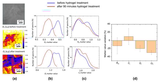 (a) Upper, optical image of XIX century paper (Brehm 1896) area before hydrogel treatment. Raman map of OT marker before and after 90 min of cleaning procedure. (b), (c) RH, CI, OI, and OT marker distributions before (blue line) and after (red line) hydrogel treatment (t = 90 min). (d) Variation after 90 min hydrogel treatment of marker distribution mean values with the corresponding distribution widths.