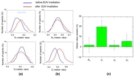 (a,b) RH, CI, OI, OT marker distributions before (blue line) and after (red line) EUV irradiation at a fluence of 200 mJ/cm2; (c) Variation, after EUV irradiation, of marker distribution mean values with the corresponding distribution widths.