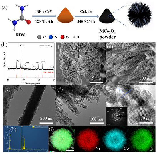 (a) Schematic diagram of the preparation for the sea urchin-like NiCo2O4 catalysts. (b) XRD pattern of the sea urchin-like NiCo2O4. (c,d) The SEM images of the sea urchin-like NiCo2O4. (e,f) The TEM images of the sea urchin-like NiCo2O4. (g) TEM image of the sea urchin-like NiCo2O4 (inset: selected area electron diffraction pattern). (h) EDS element content image. (i) EDS mapping images of sea urchin-like NiCo2O4.