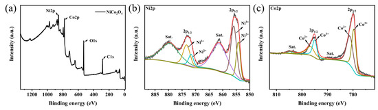 XPS diagram of the sea urchin-like NiCo2O4 material (a) full spectrum, (b) Ni 2p, (c) Co 2p.