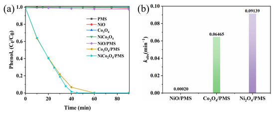 To evaluate the catalytic activity of the sea urchin-like NiCo2O4 catalyst, phenol was selected as the contaminants of this experiment. The degradation of phenol by PMS autoxidation and the adsorption of phenol by different kinds of catalysts were investigated through controlled experiments. As shown in Figure 3a, under the condition of PMS alone, the removal of phenol was less than 1% in 90 min, which indicated that PMS had no obvious degradation effect on phenol, and the degradation effect of PMS autoxidation was negligible. The absence of PMS, NiO, Co3O4 and sea urchin-like NiCo2O4 catalysts all showed similar adsorption effects on phenol, which were less than 1%, and the above results indicated that the adsorption effect of the catalysts was also negligible. In addition, three catalytic degradation systems, NiO/PMS, Co3O4/PMS and sea urchin-like NiCo2O4/PMS, were explored for phenol degradation under the same experimental conditions. The complete degradation of phenol in the sea urchin-like NiCo2O4/PMS system was 45 min, the complete degradation of phenol in the Co3O4/PMS system was 60 min and the removal of phenol in the NiO/PMS system was only about 2.5% in 90 min. The above experimental results show that the introduction of Ni substantially enhances the catalytic activity of pure cobalt oxides. This is mainly due to the synergistic effect between Ni and Co, which accelerates the electron transfer rate and, thus, improves the catalytic activity of the material [29]. Additionally, the mineralization of phenol and RhB reached 67.5% and 62.7%, as displayed in Figure S3a,b, respectively, indicating that significant quantities of organic compounds were degraded to inorganic carbides in the NiCo2O4/PMS system. In summary, the sea urchin-like NiCo2O4 exhibits the best catalytic activity.