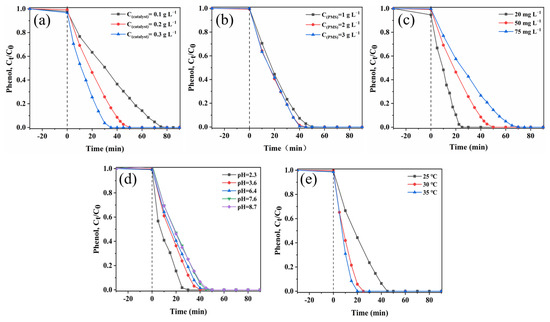 Figure 4c and Figure S4c show the effect of different initial concentrations of phenol (between 20 mg L−1–75 mg L−1) on the degradation process. Both the degradation efficiency of phenol and the rate constant of the reaction decreased with an increasing phenol concentration. At a low phenol concentration (20 mg L−1), 100% degradation of phenol could be achieved within 25 min. As the concentration of phenol further increased to 50 mg L−1 and 75 mg L−1, the time required for its complete degradation increased to 50 min and 70 min, respectively. The corresponding k values decreased from 0.14122 min−1 to 0.07450 min−1 and 0.05621 min−1, respectively. The main reason is that the number of active species is certain and, thus, a longer degradation time is needed with a higher concentration of phenol solution. In addition, more intermediates adsorbed on the catalyst surface are generated in highly concentrated phenol solutions, thus preventing PMS from binding to the catalyst active sites.