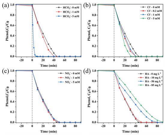 Large amounts of inorganic anions and humic acids (HAs) are universally present in natural aquatic systems. Undoubtedly, they may affect the degradation process of pollutants due to the reaction with free radicals. To investigate the practical value of the NiCo2O4/PMS system in environmental aquatic systems, the effects of inorganic anions (HCO3−, Cl−, NO3−) and HA on the degradation performance of phenol were systematically investigated in this experiment. The specific experimental results and analysis are as follows.