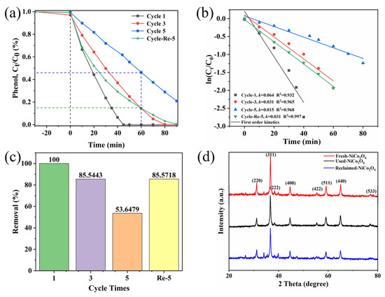 (a) Ct/C0-t diagram of phenol degradation in the cycling experiment. (b) The first-order kinetic simulation of the reaction in the cycling experiment. (c) Histogram of the phenol removal rate at 60 min in the cycling experiment. (d) Fresh and used XRD patterns of sea urchin-like NiCo2O4.