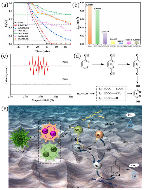 (a) The effect of various radical quenchers (TBA, MeOH, p-BQ and L-His) on phenol degradation in NiCo2O4/PMS system. (b) Histogram of rate constants for different quenching reactions. (c) EPR spectra of DMPO-SO4•− and DMPO-•OH at the first and the 10th minute. (d) Proposed decomposition pathway of phenol. (e) PMS activation mechanism of the sea urchin-like NiCo2O4/PMS system (conditions: (phenol) = 50 mg L−1, (catalyst) = 0.2 g L−1, (PMS) = 2 g L−1, T = 25 °C).