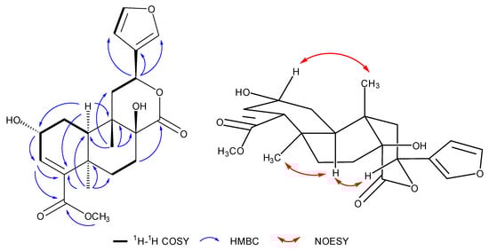 Key 1H–1H COSY, HMBC, and NOESY correlations of compound 10.