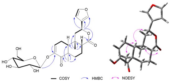 Compound 10 was isolated as an amorphous, colorless semisolid. The molecular formula was deduced as C25H32O6, through the molecular ion peak [M + H]+ at m/z 493.2061 (calcd. for 493.2074, C25H33O6) in positive HR-FAB-MS, suggesting 10 degrees of unsaturation. The 1H-NMR data (Table 1) displayed the characteristic signals for a furan moiety at δH 7.59 (br s), 7.49 (t, J = 2.0 Hz), and 6.54 (d, J = 2.0 Hz); an olefinic proton at δH 6.30 (dd, J = 6.5, 2.5 Hz); an oxymethine signal at δH 5.57 (dd, J = 12.5, 4.0 Hz); and two methyls at δH 1.28 (s) and 0.97 (s). 13C-NMR (Table 1) revealed the presence of two carbonyl carbons at δC 200.5 and 174.8; aromatic carbons at δC 149.2, 145.0, 141.4, 126.8, 124.3, and 109.6; and two angular methyls at δC 29.0 and 26.6. All these data of 1 were similar to those of sagitone, a novel 18-norclerodane furanoditerpenoid isolated from the roots of Tinospora sagittata var. yunnanensis [14]. However, additional signals belonging to a glucopyranoside at δC 102.3, 74.6, 78.3, 71.3, 77.6, and 62.5, corresponding to δH 4.62, 3.84, 3.65, 3.39, 3.38, 3.34, and 3.32 in the HSQC spectrum, were also observed [28]. After acid hydrolysis, the sugar moiety was determined as D-glucose, based on the optical rotation detected by an optical detector through HPLC. Also, the large coupling constant exhibited by the anomeric proton at δH 4.62 (1H, d, J = 7.0 Hz) suggested the relative configuration as β-oriented (Figure 4). In addition, the experimental ECD of 10 was close to 1 (Figure 5), indicating a similar relative configuration. Thus, the structure of 10 was established and named tinobakiside.