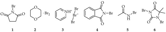 One of the key steps in the preparation of cationic 1,4-DHPs is the bromination of methyl groups at positions 2 and 6 of its ring [33]. The most commonly used reagent is N-bromosuccinimide (NBS) (1, Figure 1). For 1,4-DHP-3,5-dicarboxylates with long alkyl chains, bromination requires long reaction times (20–24 h) with low to moderate yields of the products (up to 75%) [34]. Also, bromination of methyl groups of tetradodecyl 4,4′-(1,4-phenylene)bis(2,6-dimethyl-1,4-dihydropyridine-3,5-dicarboxylate) was performed by NBS in methanol at r.t. for 12 h, giving 1,4-phenylene-bis(2,6-bis(bromomethyl)-1,4-dihydropyridine with a yield of 43% [24]. One of the first reported selective methods for bromination of methyl groups at the 2 and 6 positions of the 1,4-DHP ring was the use of bromine in chloroform or dioxane dibromide (2, Figure 1) in dioxane [35]. Pyridinium bromide–perbromide (PBPB) (3, Figure 1) was also used to produce mono- or dibromomethyl 1,4-DHPs. The reaction was reported by two research groups, but no new papers using this reagent have been published since then [36,37]. N-bromophthalimide (4, Figure 1), N-bromoacetamide (5, Figure 1) and 1,3-dibromo-5,5-dimethylhydantoin (DBDMH) (6, Figure 1) were also utilized as bromine sources for chiral phosphoric acid catalyzed enantioselective desymmetrization of 1,4-DHPs via selective bromination of methyl groups [32].