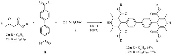 Synthesis of bis-1,4-dihydropyridines 10a,b via Hantzsch synthesis.