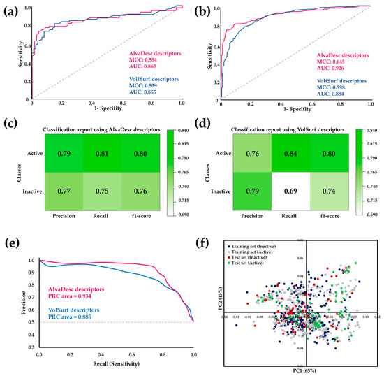 ROC curve comparison for the RF model using AlvaDesc and VolSurf descriptors for (a) test sets and (b) cross-validation. Performance evaluation of RF using (c) AlvaDesc and (d)VolSurf descriptors. (e) Precision–recall (PR) curves for cross-validation. (f) Scatter plots depicting the results of the PCA analysis conducted on the training and test datasets.