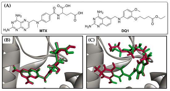 (A) Chemical structures of reference ligands: Methotrexate (MTX) and ethyl 4-(5-{[(2,4-diaminoquinazolin-6-yl)methyl]amino}-2-methoxyphenoxy)butanoate (DQ1). Redocking results of (B) MTX and (C) DQ1 in the active site of LmDHFR-TS. The original ligand conformation is highlighted in red, while the best pose found in the molecular docking procedure is shown in green.