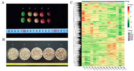 Before harvesting, a coffee cherry goes through different stages of growth and development, which are the duration of the formation of flavors and active substances. These substances play a vital role in influencing the quality of coffee beverages [16]. Therefore, to better understand the coffee cherry development and ripening process, our study analyzed metabolite changes in green coffee beans at different maturity levels using widely targeted metabolomics based on UPLC-MS/MS. In addition, we focused on the correlation between flavor precursors and taste-related indicators, aiming to provide some reference and insight into the process of coffee flavor substance formation. Changes in color were used to indicate the maturity of coffee cherries (Figure 1A), which were divided into five different maturity stages, GF, ROF, BRF, PRF, and PBF (refer to Figure 1A for a,b,c,d,e, respectively). After the same pre-treatment, the green coffee beans (Figure 1B) were subjected to widely targeted metabolomics analysis. A total of 1078 metabolites were identified, including sugars, amino acids, nucleotides, lipids, and phenolic acids. A large number of these metabolites are flavor and aroma precursors of volatile compounds produced during the roasting process, as well as secondary metabolites with substantial nutritional value and health functions in coffee (Figure 1B and Table S1). A hierarchical cluster analysis (HCA) showed that all biological replicates from the same maturity were clustered together, denoting the reliability of the metabolic profiling data (Figure 1C). Among these, the samples from the five different metabolites were clearly separated, which implies that a large number of metabolites are differentially accumulated between these samples.