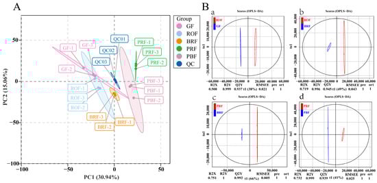 (A) Principal component analysis (PCA) of metabolites in coffee beans at different maturity levels. Note: Each maturity level had three individual samples. Equal volumes of samples were mixed for use as the quality control (QC). (B) OPLS-DA of metabolites in five different maturity treatments among GF, ROF, BRF, PRF, and PBF. (a) GF versus ROF. (b) ROF versus BRF. (c) BRF versus PRF. (d) PRF versus PBF.