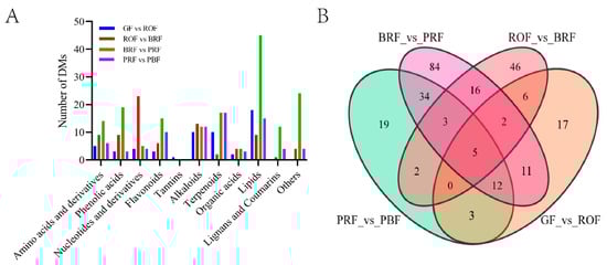 (A) Classification and statistics of DMs in green coffee beans at five ripeness. Others mainly include saccharides and vitamins. (B) A Venn diagram of DMs.