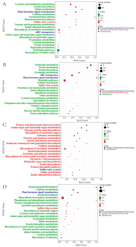 To further clarify the biological pathways involved in the significant enrichment of DMs during cherry ripening, we performed a KEGG enrichment analysis. According to the KEGG annotations, 20 pathways were significantly enriched in total for the five stages (p < 0.05). As shown in Figure 4A, for the GF stage versus the ROF stage, the representational enriched terms were “cysteine and methionine metabolism”, “zeatin biosynthesis”, “sulfur metabolism”, “plant hormone signal transduction”, “caffeine metabolism”, etc. The synthesis and metabolism of amino acids and derivatives are very active at this stage. Amino acids can be used as one of the flavor precursors to directly produce sweetness, freshness, and so on. In our research, amino acids and precursors such as O-acetyl serine, N-formyl-L-methionine, 5′-deoxy-5′-methylthioadenosine, and L-cystine were significantly increased (Figure 5A). That indicates active synthesis of cysteine, cystine, and methionine. Most of them are volatile and strong olfactory substances. Among them, methionine produces maltiness and fruitiness, while cysteine and cystine are important components of cooked meat and butter aromas, which strongly influence the flavor of coffee beverages [24].