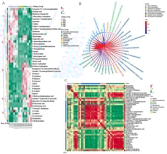 Clustering analysis of 46 target metabolites in green coffee beans at five maturity levels; the metabolites are grouped by compound class. (A) Hierarchical clustering analysis of metabolites and different maturity levels; five main branches were generated. (B) Correlation between taste indicators and metabolites; the correlation coefficients were calculated using Pearson’s test (Pearson’ r > 0.8, p < 0.05). (C) Visualizations of metabolite–metabolite correlations were calculated using a Pearson correlation analysis (p < 0.05).