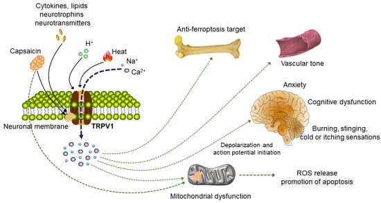 TRPV1 is a non-selective cation channel that can be activated by various physical and chemical stimuli, including heat (temperature > 43 °C), voltage, low PH (pH < 6) and vanillin [,]. It also can be activated by other lipid molecules, such as anandamide, N-arachidonoyldopamine and N-oleoyldopamine [,,]. Once activated, the ion channel is opened, and permeability to calcium-based high-valence cations is increased, resulting in the flow of calcium ions into the cells to effectively depolarize them, generating action potential and stimulating various physiological activities [,] (Figure 2). Activation of TRPV1 can mediate the calcium influx, which increases the mitochondrial calcium and caspase activation and promotes the release of reactive oxygen species (ROS), leading to pro-apoptotic activity and neurotoxicity [,]. Reports have indicated that TRPV1 also is expressed in vascular smooth muscle cells []. Capsaicin activation of this channel demonstrates the potential for vasoconstriction, and suggests that the unnecessarily high consumption of capsaicin may lead to serious consequences, including vasospasm and myocardial infarction in potentially inflammatory patients []. Accumulated studies have shown that TRPV1 activation plays an important role in the generation and transmission of cold sensations, pain regulation, the pathophysiology of asthma, chronic pruritus, migraines, gastrointestinal motility disorders, anxiety and cognitive dysfunction [,,,,] (Figure 2). Therefore, TRPV1 is considered a promising potential therapeutic target for the treatment of many human diseases [].