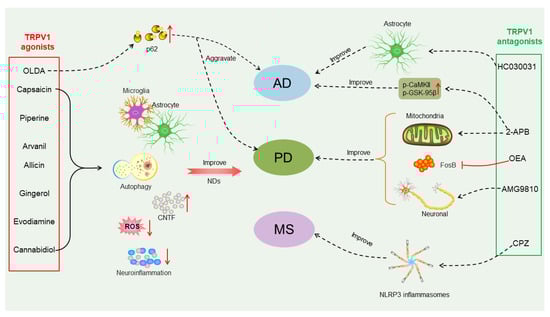 Different effects of TRPV1 agonists or antagonists on treatment of neurodegenerative diseases (NDs). TRPV1 agonists such as capsaicin, piperine, arvanil, allicin, gingerol, evodiamine and cannabidiol can improve NDs, including Alzheimer’s disease (AD), Parkinson’s disease (PD) and multiple sclerosis (MS), by acting on microglia or astrocytes, increasing autophagy, reducing neuroinflammation and reactive oxygen species production, mediating the production of ciliary neurotrophic factor (CNTF) and stimulating the body’s protective mechanisms. N-oleoyldopamin (OLDA) is also a TRPV1 agonist, and it enhances protein aggregation via regulating expression of p62/SQSTM1 and may exacerbate protein aggregation in AD and PD. TRPV1 antagonists 2-Aminoethoxydiphenyl borate (2-APB), oleoylethanolamide (OEA) and AMG9810 can be used to treat PD by rescuing mitochondrial dysfunction, inhibiting stromal FosB overexpression, and rescuing neuronal death. Among them, 2-ABP can also increase p-calmodulin dependent kinase II (CaMKII) and p-GSK-95β equal calcium to improve AD. TRPV1 antagonists HC030031 and capsazepine (CZP) can be used to treat AD and MS by acting on astrocytes and NLRP3 inflammasomes, respectively.