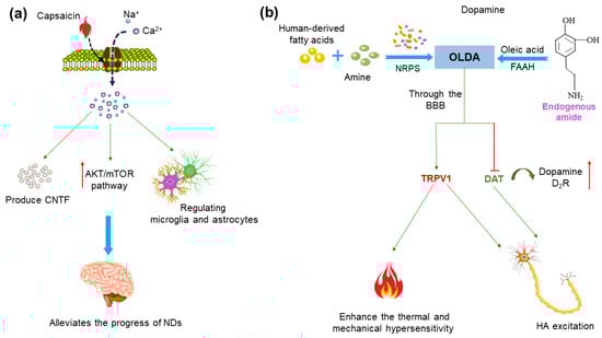 Potential mechanisms of treatment of neurodegenerative diseases (NDs) using capsaicin and N-oleoyldopamin (OLDA). (a) Capsaicin activates the TRPV1 receptor and Ca2+ influx, which can induce the upregulation of microglia phagocytosis, regulate its metabolic process and inhibit oxidative stress in microglia and astrocytes. It also can mediate the endogenous production of ciliary neurotrophic factor (CNTF), thereby stimulating activity of tyrosine hydroxylase (TH) enzyme and activating endogenous neuroprotective mechanisms. Activation of the TRPV1 channel upregulates the AKT/mTOR signaling pathway and reduces the production of inflammatory molecules. (b) OLDA in the human body comes from two pathways: one is the combination of dopamine and oleic acid under the action of fatty acid amide hydrolase (FAAH). Moreover, clostridium in the intestine can also bind foreign substrates (fatty acids) commonly found in the human body or diet with amines under the action of non-ribosomal peptide synthases (NRPS) to produce OLDA. OLDA can reach the brain via the blood–brain barrier (BBB), enhancing thermal and mechanical hypersensitivity by activating the TRPV1 receptor. OLDA activates TRPV1 and blocking dopamine transporter (DAT) and dopamine 2 receptor (D2R) activation, and then leads to a wake-on-firing pattern of histaminergic (HA) neurons, which may have beneficial effects on the treatment of PD.