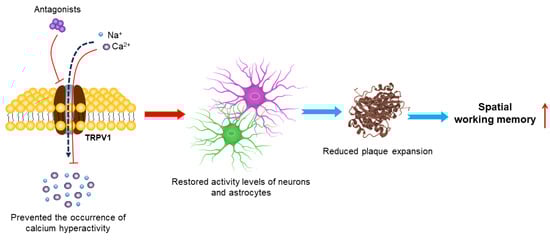 Mechanisms of TRPV1 antagonists in treating AD. Inhibition of the TRPV1 channel by its antagonist prevents occurrence of astrocyte calcium hyperactivity, restores neuronal and astrocyte activity levels and increases plaque compaction and diffusion. This early multi-level neuroprotection seems to prevent subsequent decline in spatial working memory.